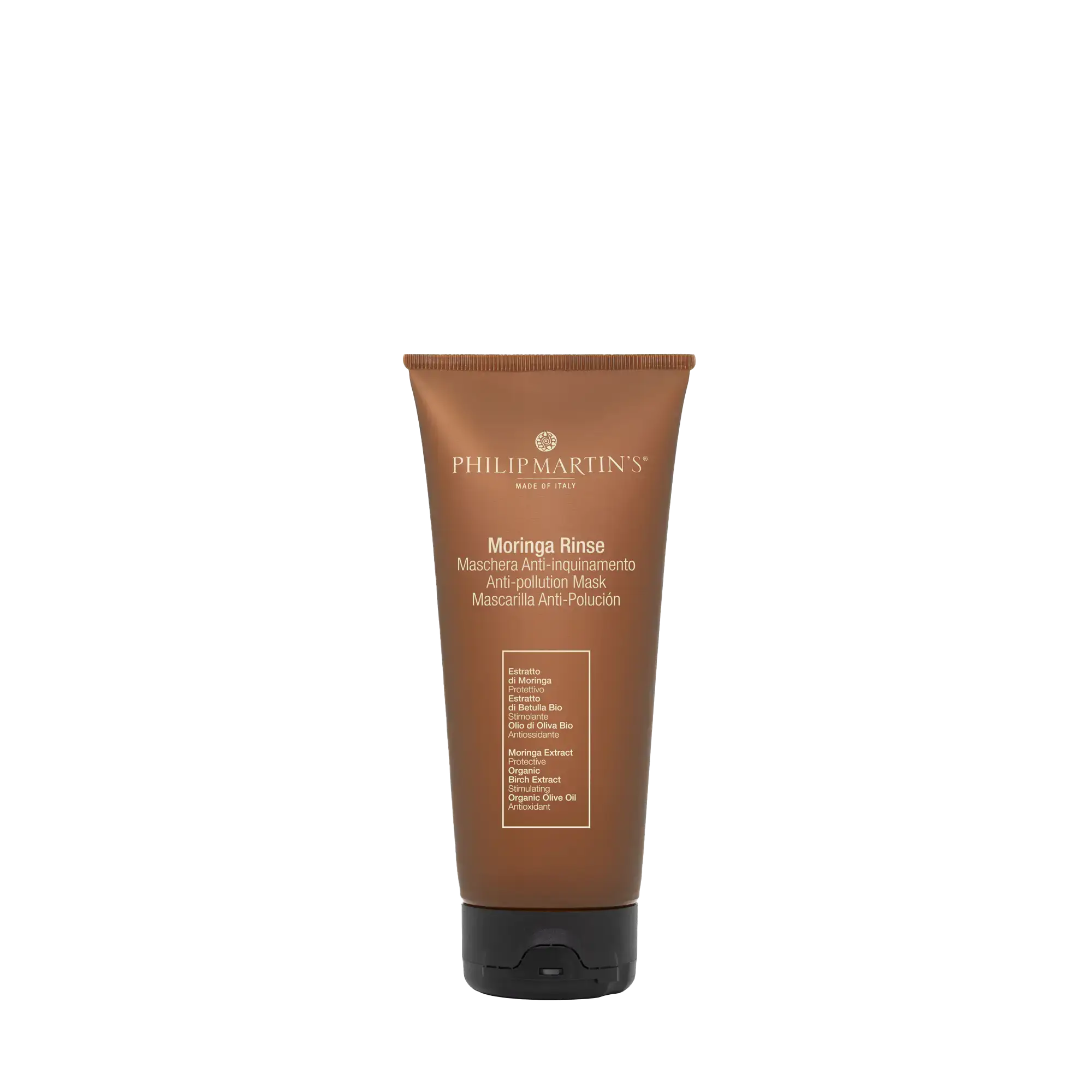 Máscara hidratante que, gracias a la alta concentración del extracto de moringa, protege el cabello de la contaminación. Sin sulfatos ni parabenos.